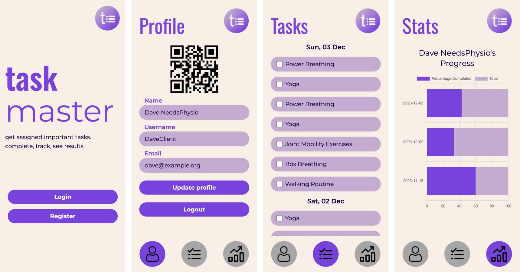 Task Master allows physiotherapists to seamlessly assign tasks to their clients, track progress, and enhance communication; promoting client engagement and monitoring exercises effectively.